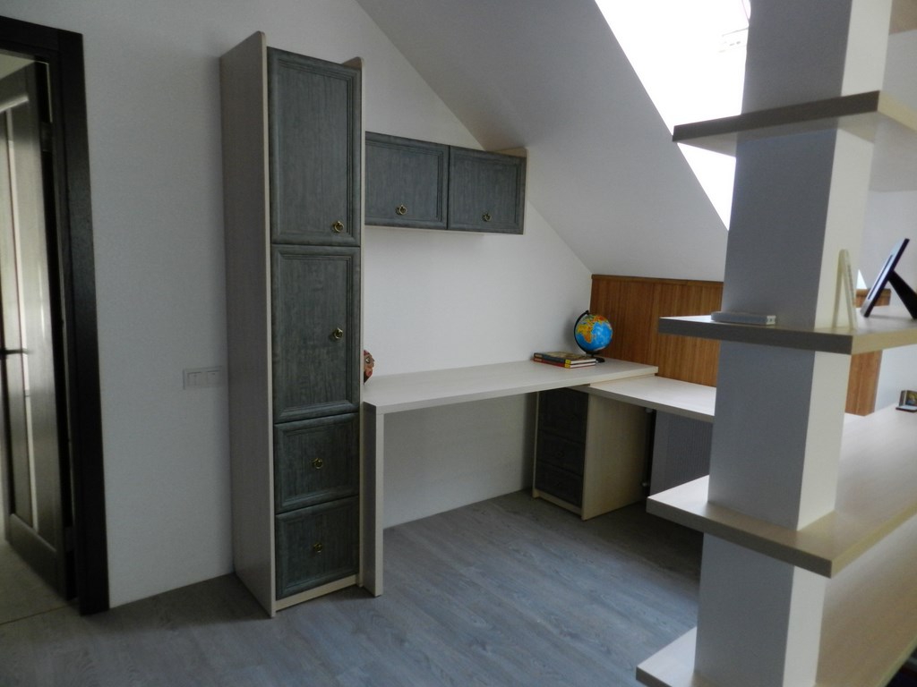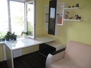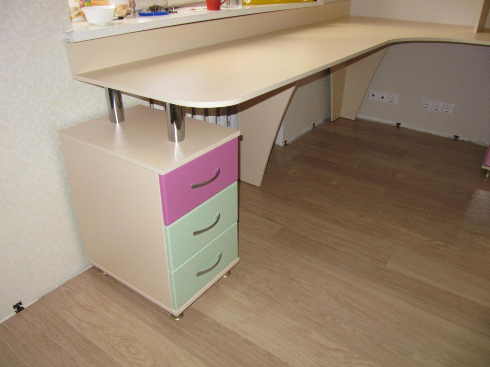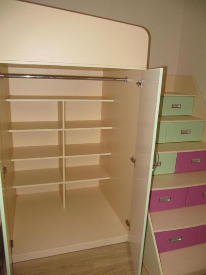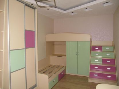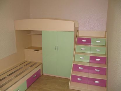 Дизайнер нашей компании подготовил проект с максимальной вместимостью для данной площади. Стол был спроектирован таким образом, что за ним можно заниматься сразу вдвоем. Кровати спроектировали одну внизу, другую сверху, а в ступеньках на верхнюю кровать изготовлены выдвижные ящики, которые дают дополнительное место для хранения. Так же удалось поставить небольшой, но вместительный шкаф купе, который так же дает немало места для хранения вещей. Корпус детской мебели выполнен из лдсп двух цветов кремовый и светло-зеленый, фасады выполнены из мдф.