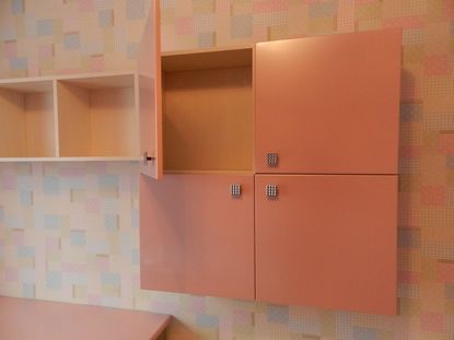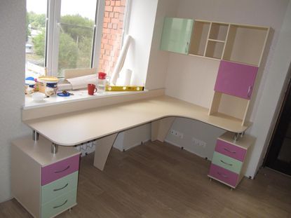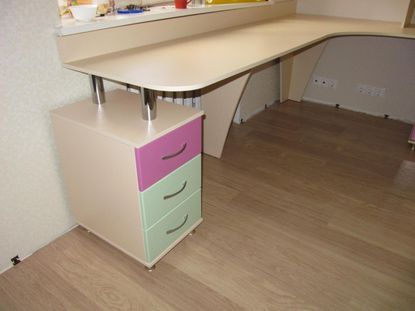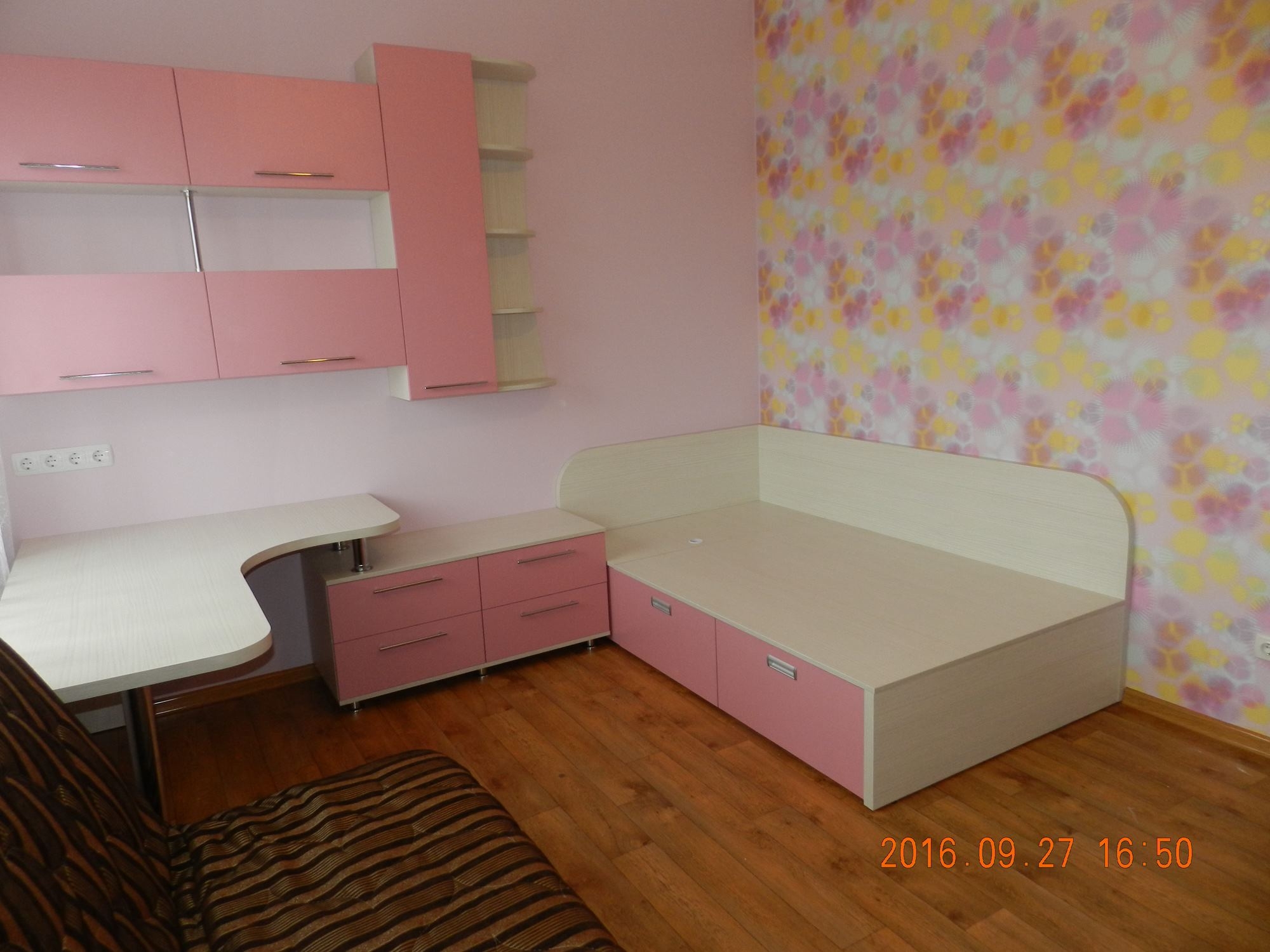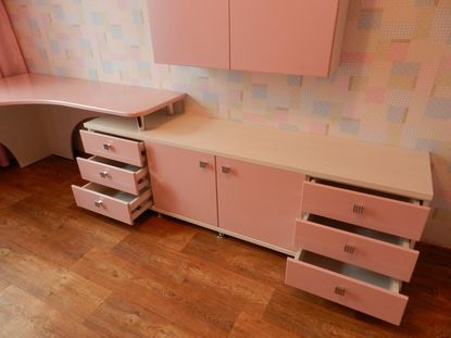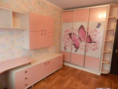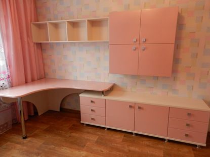 Клиенту требовалось оборудовать детскую комнату для девочки в светло-розовых тонах, где хотелось разместить большой стол, стенку и вместительный шкаф купе.
