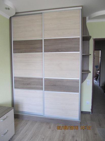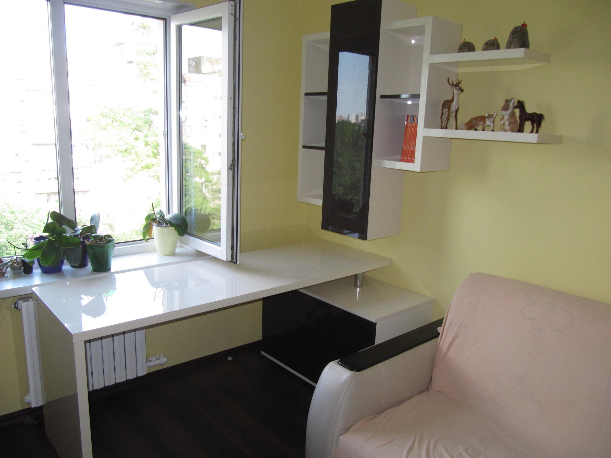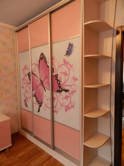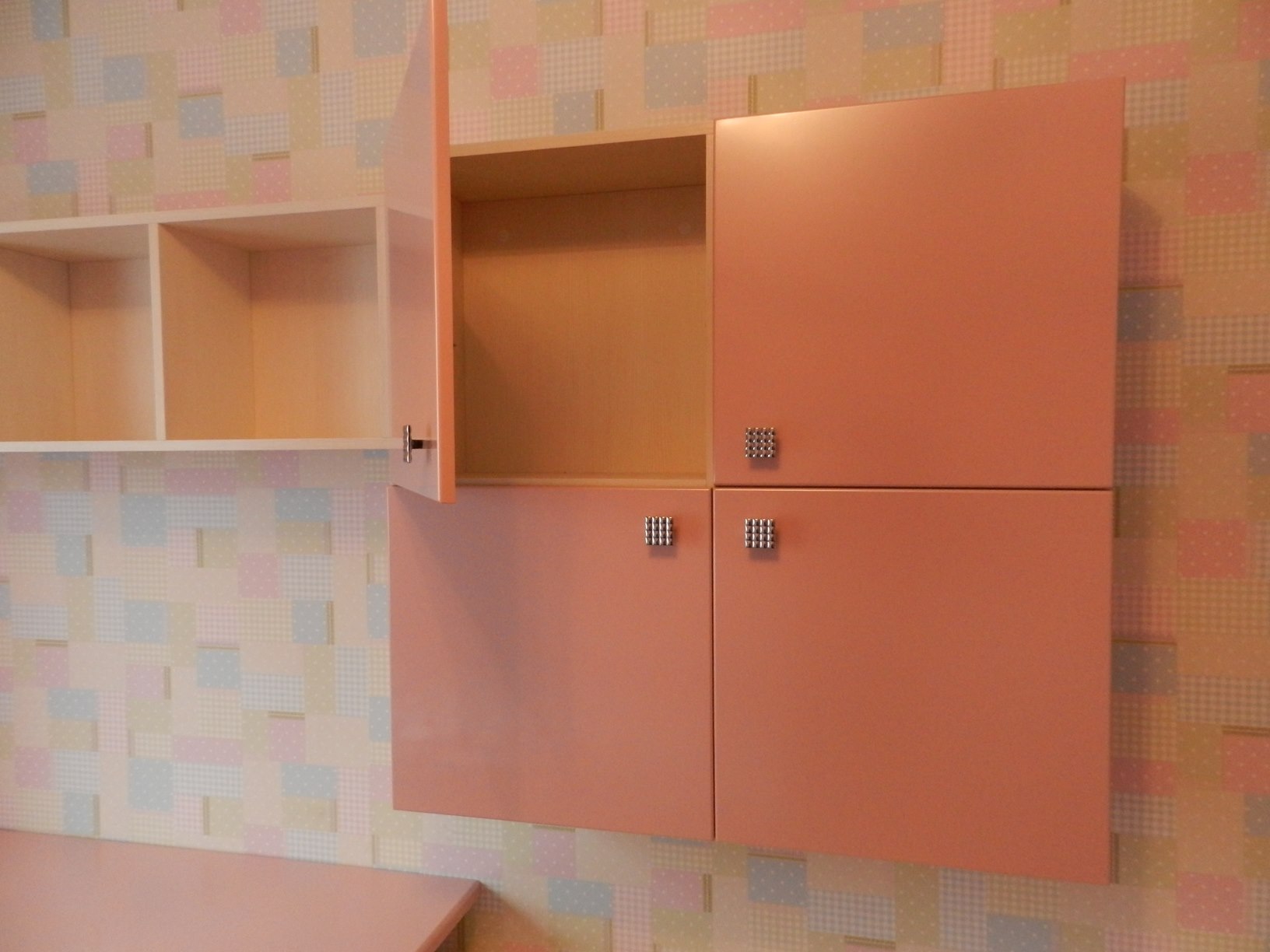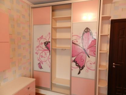 Специалисты нашей компании подготовили проект, особенностью проекта является стол, переходящий в стенку. Были применены следующие материлы – лдсп вудлайн кремовый и мдф розовый глянец. Вставки в шкафу купе широкоформатная печать на стекле.