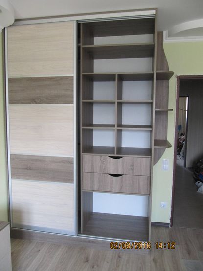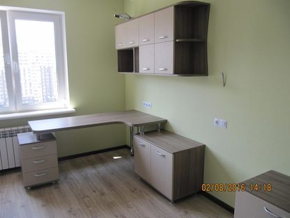 Нашей компанией был подготовлен проект, в котором были применены следующие материалы лдсп дуб сонома и фасады мдф, все направляющие и петли с доводчиками. Данную цветовую гамму выбрали не случайно, т.к. комната для подростка были выбраны более “взрослые” тона. Был изготовлен большой угловой стол, опорами столешницы с одной стороны является тумба я ящиками, а с другой стороны тумба с распашными дверями, что дает большое место для хранения. Так же установили навесной шкаф на стену, что еще увеличило место для хранения.